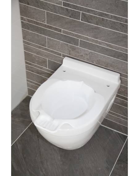 Aide pratique pour laver le bas du corps. Avec petit porte-savon. Convient sur la majorité des toilettes. Ne pas utiliser avec un rehausseur. Profondeur: 30 cm. Largeur intérieure: 25 cm.