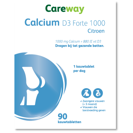 CAREWAY Calcium D3 Forte 1000/880 : 2.500 mg calcium carbonaat (125% RI*), 22 µg cholecalciferol (vitamine D3 880 IE, 440 % RI*).